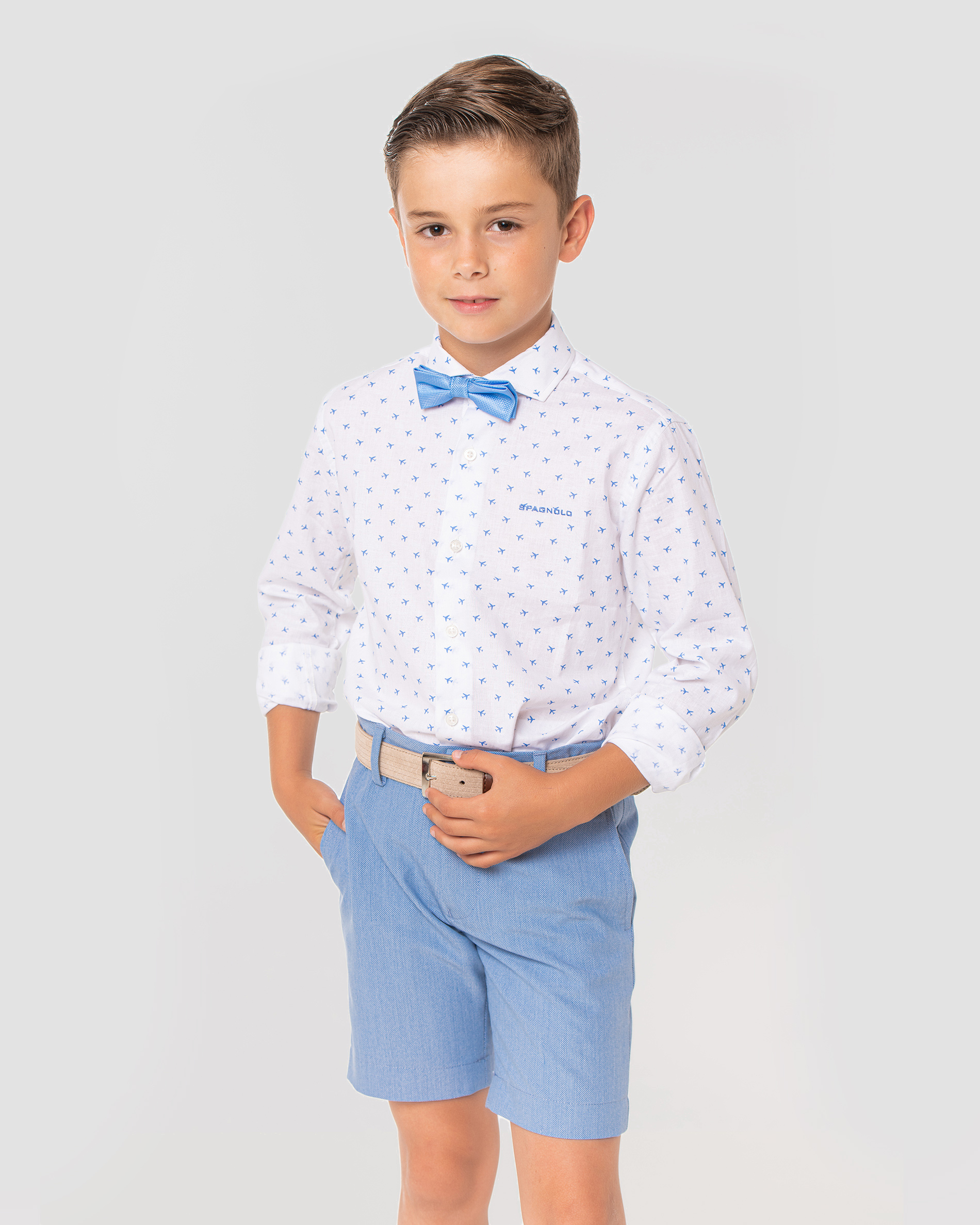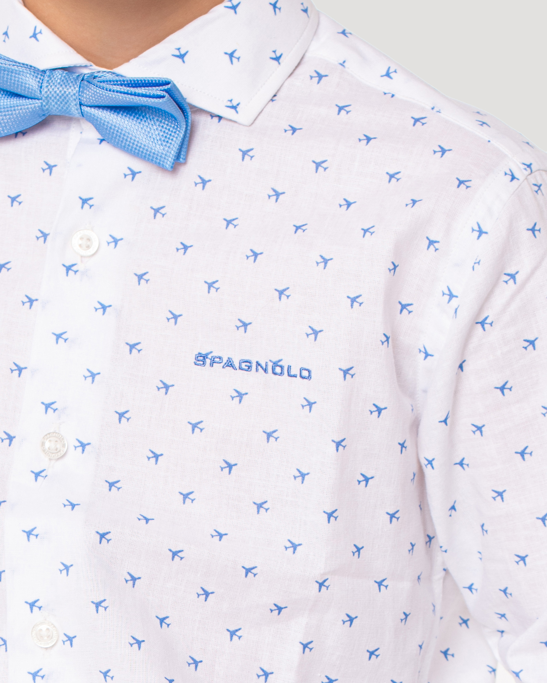 Camisa de niño de manga larga con cuello cutaway y puños sencillos. Confeccionada en tejido popelin con estampado y bordado de letras Spagnolo en el pecho.