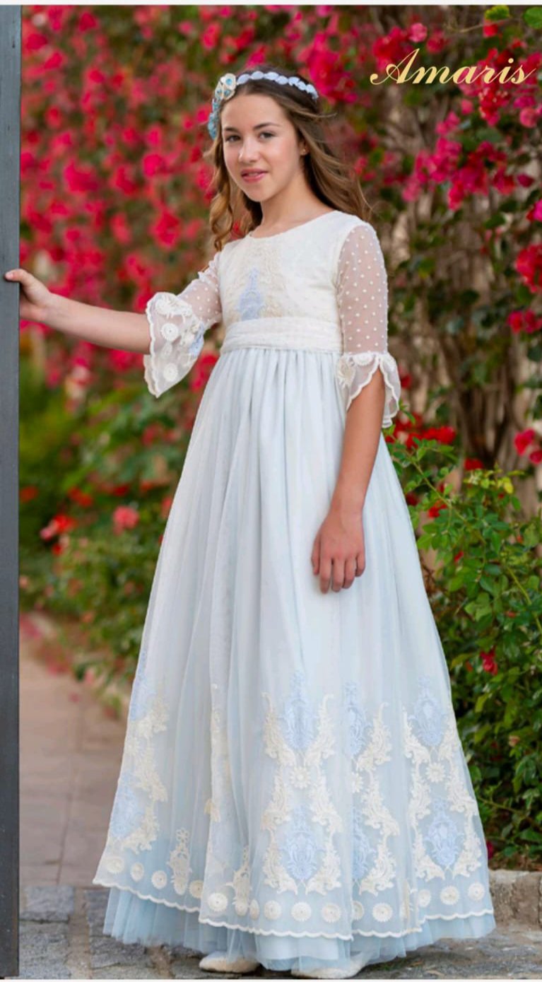vestido tull plumeti con color de fondo celeste.